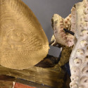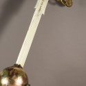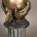 Dominant is the ornately gilded white sword; white being silent, like clouds or soft cotton, and the blade, a deadly snake that strikes to neutralize, then devour. Swords represent overt strength and have only one job; to kill. Carbon Dioxide, when in amounts too large to be absorbed quickly, causes asphyxiation and death. I chose a globe that was created in a bronze color, to help reflect the dirtiness the world has become. I chose dark, earthy colors to represent time immemorial, when the world was thought of as endless, new, and chaotic. Now, people know its dimensions, the highs and lows, its compositional make up etc. it is taken for granted and polluted.