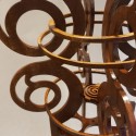 I had given myself the task of creating something out of wood that was less grandiose, but still relevant to the theme. I had watched a show on Oregon Public Broadcasting about elephants in the Saharan Desert. These creatures have long memories and remember where they’ve been and whom they have known. Watching this program and seeing them struggle against draught was impactful. They traveled across the continent using time-worn paths and passed ancient bones of other deceased elephants that they treated with reverence and sorrow. The very nature of these acts inspired me to design Remembrances. The four faces represent the cardinal directions, the circles throughout represent the continuity of time and family ties, even those unrecognized by humanity. The brown stain is referential to the earth and the “thought bubbles” are for the ethereal thoughts of creatures not human.