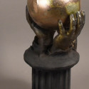 Dominant is the ornately gilded white sword; white being silent, like clouds or soft cotton, and the blade, a deadly snake that strikes to neutralize, then devour. Swords represent overt strength and have only one job; to kill. Carbon Dioxide, when in amounts too large to be absorbed quickly, causes asphyxiation and death. I chose a globe that was created in a bronze color, to help reflect the dirtiness the world has become. I chose dark, earthy colors to represent time immemorial, when the world was thought of as endless, new, and chaotic. Now, people know its dimensions, the highs and lows, its compositional make up etc. it is taken for granted and polluted.